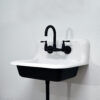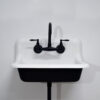 A reproduction of an early century design, this compact single basin serves well within smaller spaces. Recommended for laundry room, bathroom, and mudroom applications. This model includes a wall mount kit for those wishing to free hang the sink from a wall. The exterior of the sink is painted in Sherwin Williams TRICORN BLACK color. This listing includes the faucet and drain as shown in the imagery.